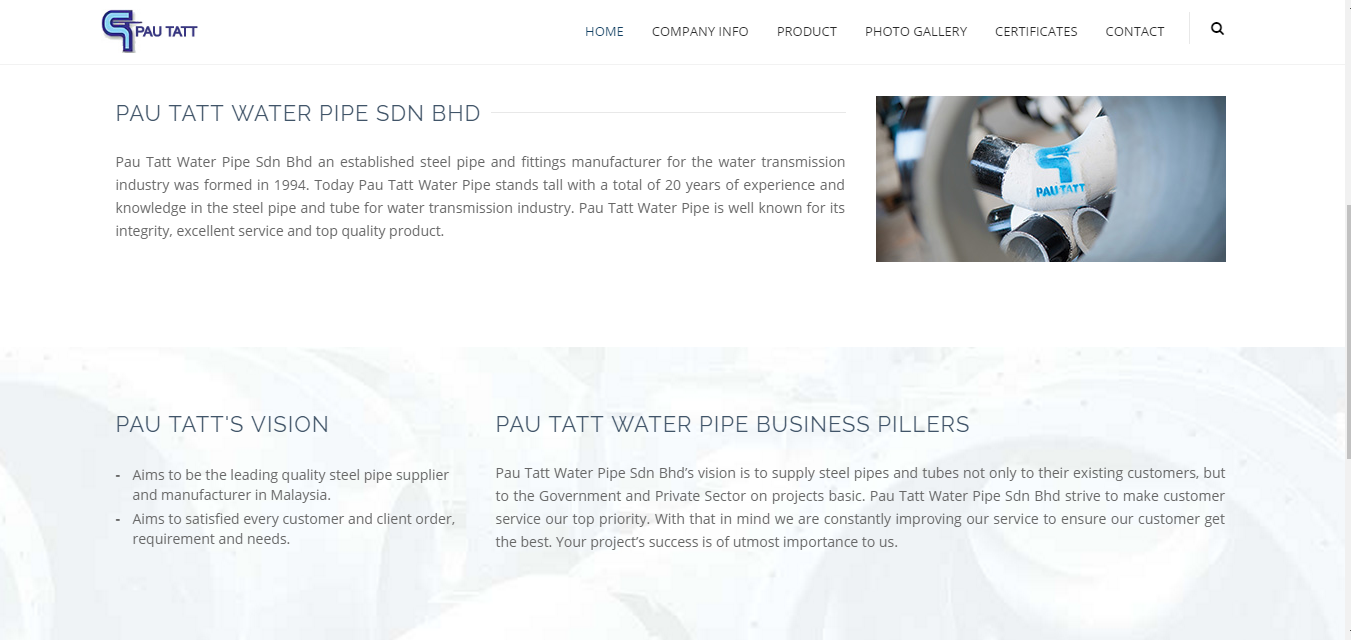 Pau Tatt Water Pipe Sdn Bhd an established steel pipe and fittings manufacturer for the water transmission industry was formed in 1994 by two partners. Formerly known as Pau Tatt Sole Proprietor, the company grew and expanded over numerous years and is now known as Pau Tatt Water Pipe Sdn. Bhd.