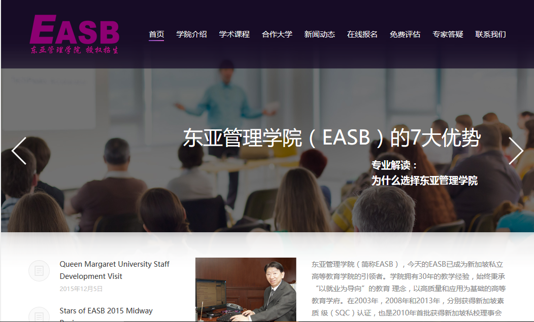 东亚管理学院(简称EASB),今天的EASB已成为新加坡私立高等教育学院的引领者。学院拥有30年的教学经验,始终秉承“以就业为导向”的教育 理念,以高质量和应用为基础的高等教育学府。在2003年,2008年和2013年,分别获得新加坡素质 级(SQC)认证,也是2010年首批获得新加坡私校理事会授予的四年“教育信托Edutrust认证”,并且 2014年成功更新4年教育信托认证(Edutrust)的少有几所私立教育机构之一。