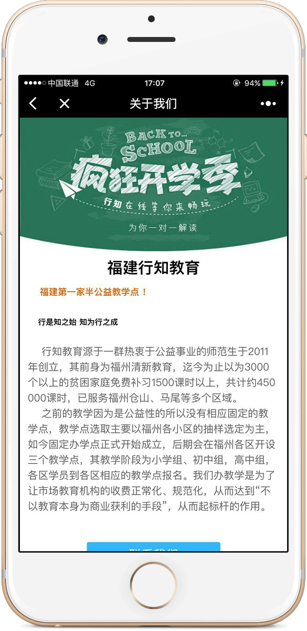 PrevNext福建行知教育官方小程序福建第一家半公益教学点 !行知之始 知为行之成,行知教育源于一群热衷于公益事业的师范生于2011年创立。官方小程序发布以来,受到广大家长的一致好评, 行知教育也由此在福州打开了全新的局面。一切依靠微信的传播力量。在移动互联网时代,我们深深的相信,只有社交才是连接用户最好的工具。 福建行知教育发展有限公司官方小程序 微信扫一扫,立刻体验 2017年9月5日微信小程序开发