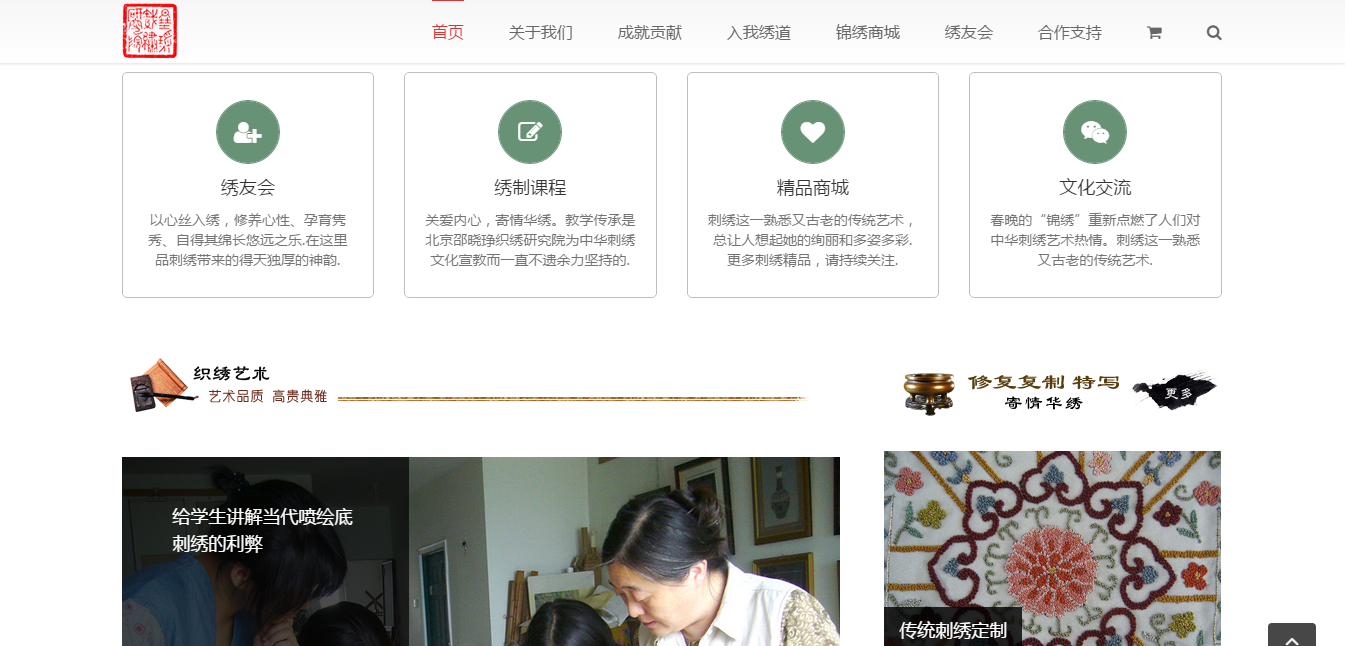 PrevNext北京邵晓琤织绣研究院北京邵晓琤织绣研究院,以中华传统文化的教学研究、保护发展、传承交流为己任,主要研究项目包括业已失传或濒临失传的中国传统艺术类刺绣、缂丝及古代书画等。进一步发掘中华千年丝织艺术,努力恢复古老技艺、培养年轻一代有高等学历背景的传人,改变有史以来民间师带徒的局限,有效地杜绝狭隘的保守思想,避免这些国粹文化智慧重新衰亡,使中华丝织艺术和文化得以光复和延承。 2015年8月28日响应式企业网站