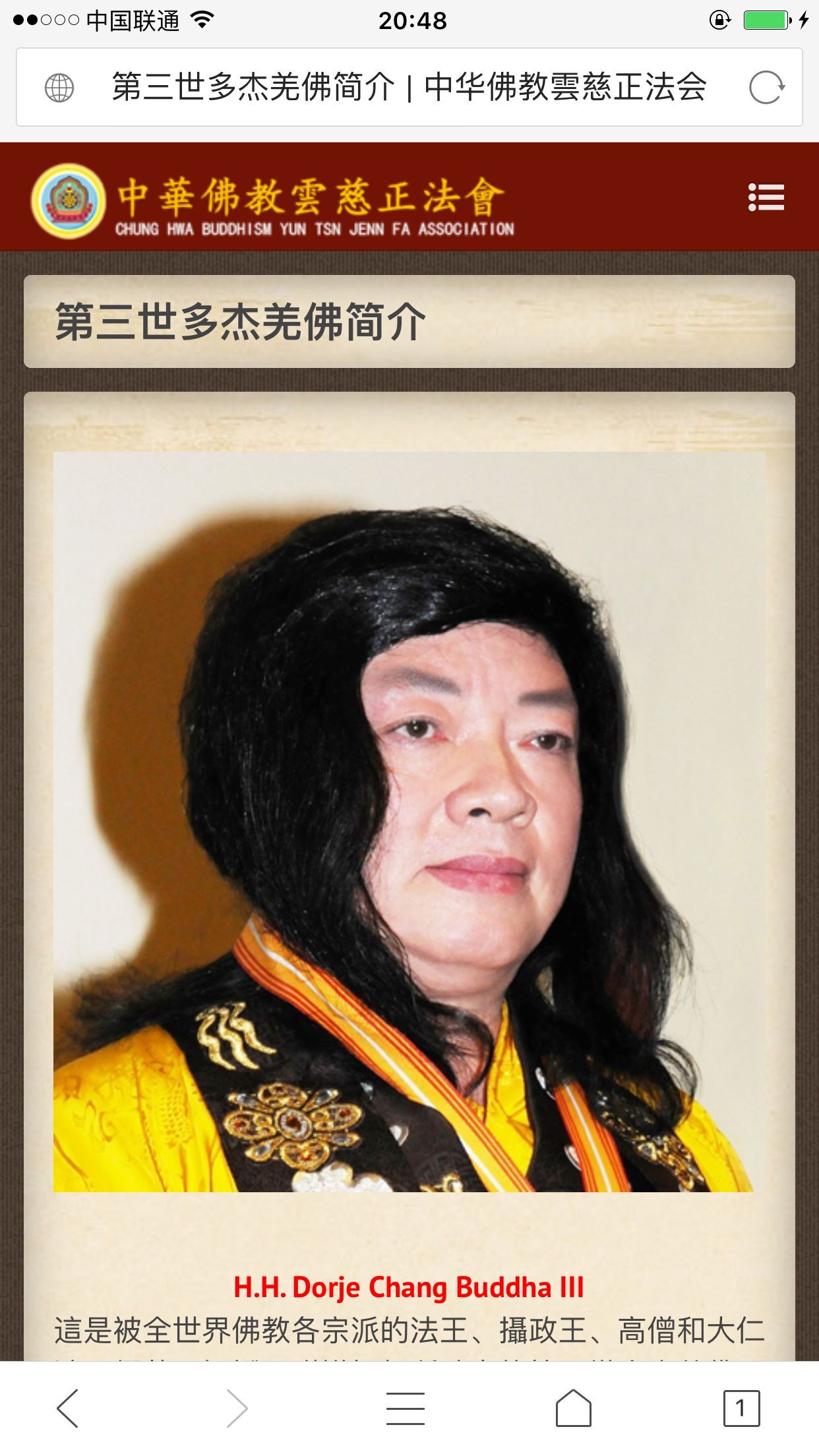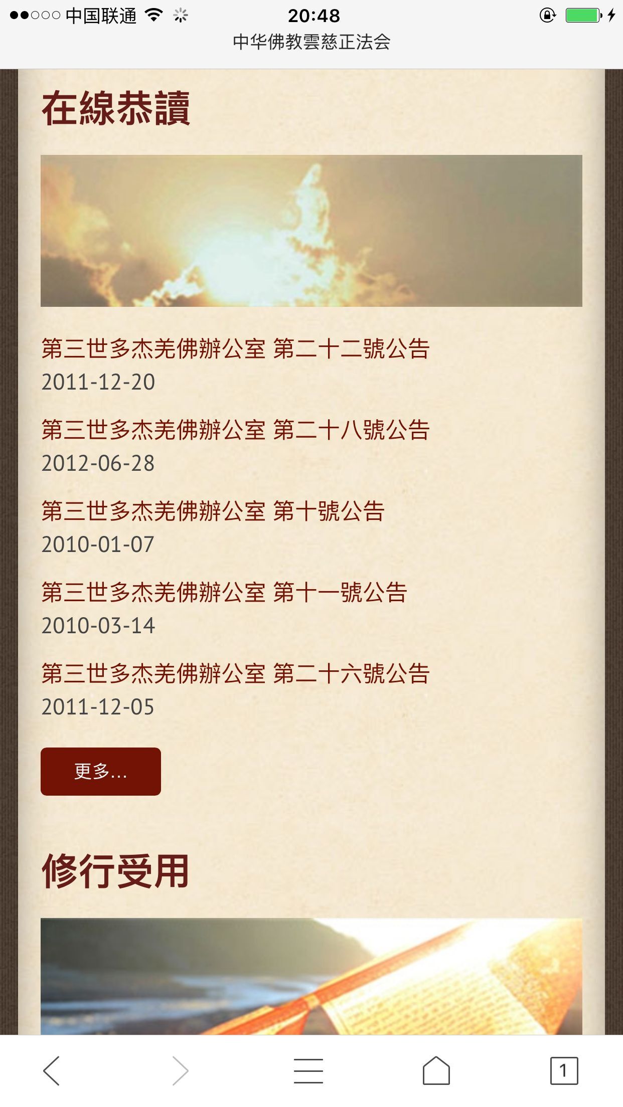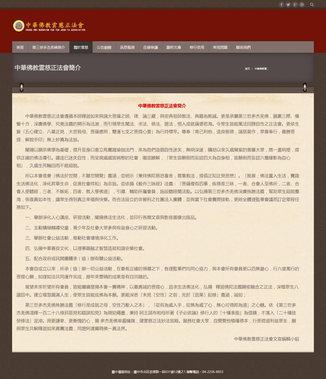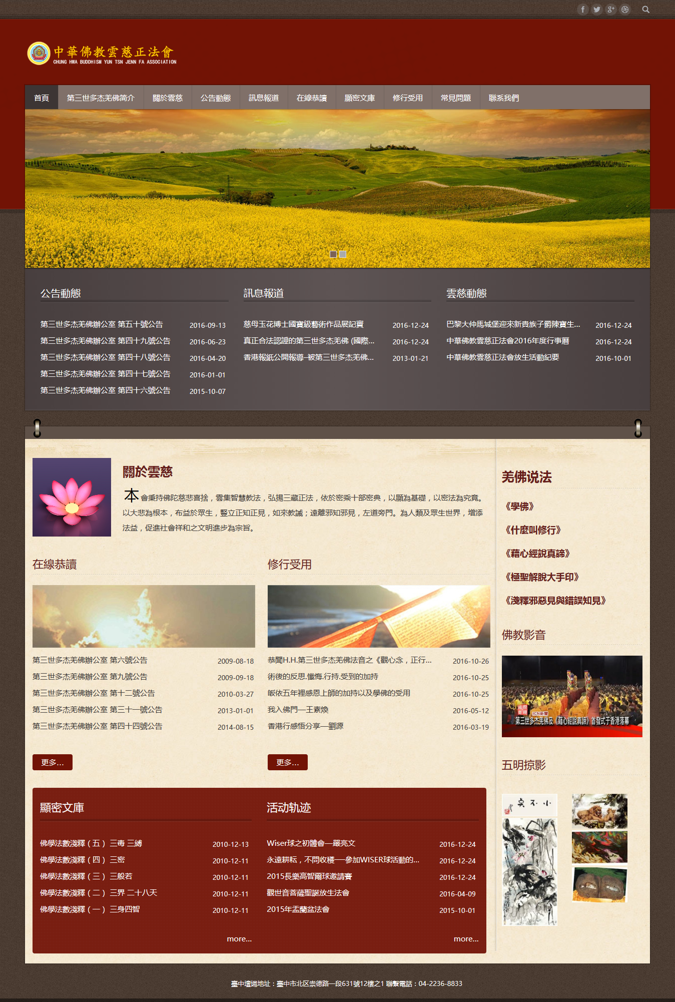 PrevNext中華佛教雲慈正法會中华佛教云慈正法会 中华佛教云慈正法会遵循本师释迦如来与诸大菩萨之经、律、论三藏,与密典祖师教法、典籍为教诫。更是承袭第三世多杰羌佛,圆 裹三际、横竖十方,深广佛学、究竟法义的开示为法源,而引领众生闻法、求法、修法、证法,悟入成就萨婆若海。令众生皆能万法 回归自性之正法会。更依生发「五心建立、八基正见,大悲我母、菩萨应照,双运七支之菩提心要」为行持标竿。尊奉「育己利他, 造良树德,诸恶莫作,众善奉行,最胜菩提,解脱手印」无上妙宝为法旨。 非常良好的手机端体验效果: 2017年1月1日响应式企业网站集团&大客户