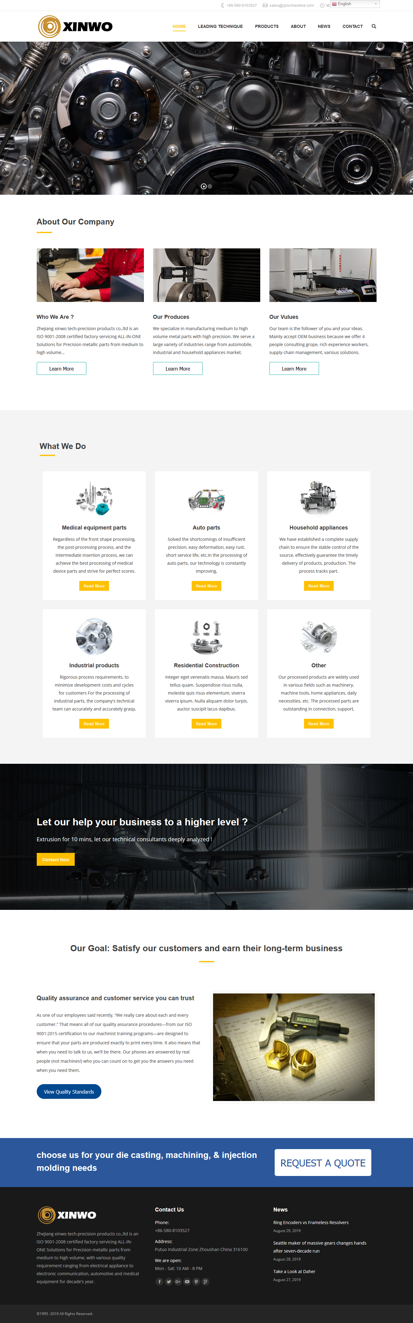上一个下一个浙江新沃科技精密制品有限公司浙江新沃科技精密制品有限公司是一家通过ISO 9001-2008认证的工厂,为中高批量精密金属零件提供ALL-IN-ONE解决方案,具有从 电器到电子通讯,汽车和医疗的各种质量要求。 一开始,我们的车间只有2CNC机器和1台冲压机械,我们的客户也不是大公司。 我们 坚持最终目标是为客户提供优质服务,通过对机器和人员的投资不断提高生产力并保持竞争力。 2019年8月30日响应式外贸网站 新浪微博分享到新浪微博腾讯微博分享到腾讯微博人人网分享到人人网QQ空间分享到QQ空间开心网分享到开心网微信分享到微信