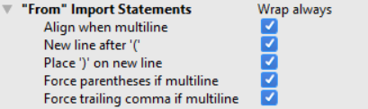 - New code style options: you can now specify in more detail how you would like to arrange multiline imports (from package import a, lot, of, things). You can configure them in Settings | Editor | Code Style | Python | Wrapping and Braces