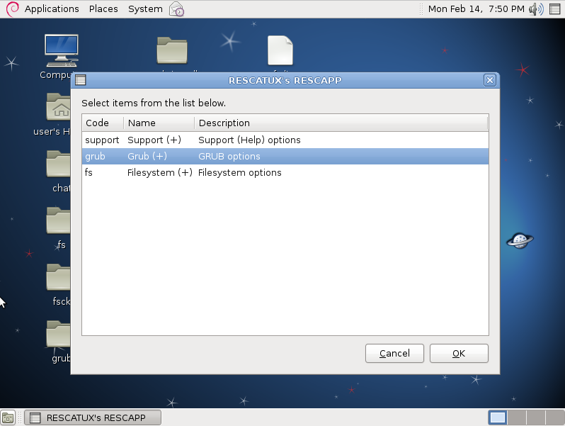 Rescatux是debian系列系统 (Ubuntu, Linux Mint 等) 下的图形化Grub/Grub2修复工具。Rescatux的最新版支持文件系统的检测。要想使用Rescatux,首先把它刻录到CD或者USB启动 上,重启,从 Live CD/USB 或启动,会自动弹出Grub 恢复界面。