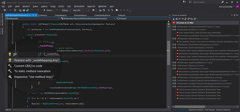 ReSharper是一款由jetbrains开发的针对C#, VB.NET, ASP.NET, XML, 和 XAML的编辑器。沿袭了jetbrains开发工具一贯的优良传统,ReSharper拥有高度智能的纠错,30多种高级代码重构功能,方便的单元测试 工具,快速导航、检索,以及一键格式化代码,自动代码生成和模板功能等很多特性。