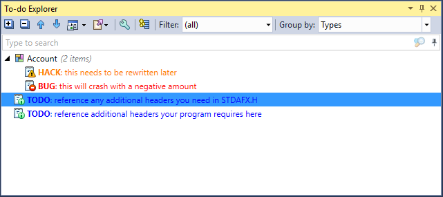 todo Explorer是一个单独的工具窗口,一直在原来的ReSharper的存在但现在即将ReSharper C++。它的目标是找到一个匹配特定模式的文本,在注释中,字符串或标识符,并显示所有的位置元素在一个单一的,易于浏览列表: