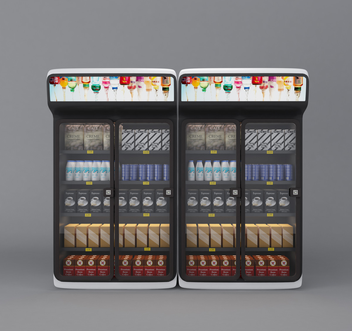 如上图所示:智能RFID自助售货机柜相对传统自助售货柜少了机柜里面的货道/取货口,并且有一个可开发的门,相对于售货机它更像一个冰箱。