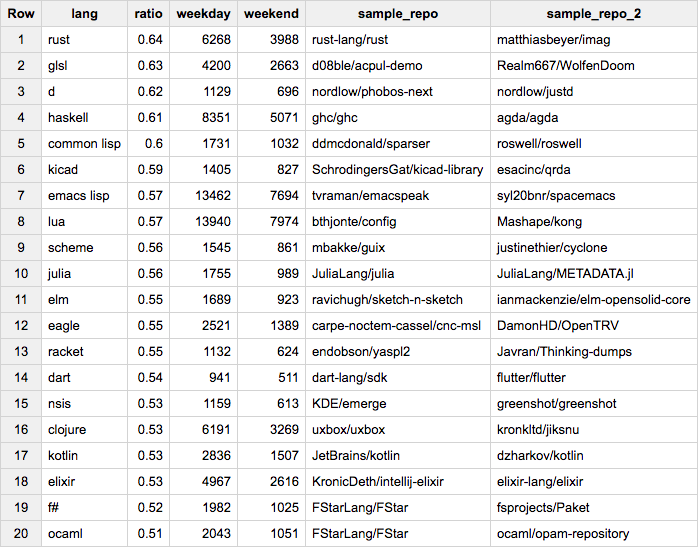 最流行的周末编程语言包括:Rust、Glsl、D、Haskell、 Common Lisp、Kicad、Emacs Lisp、Lua、Scheme、Julia、Elm、Eagle、 Racket、Dart、Nsis、 Clojure、 Kotlin、Elixir、F#、Ocaml;最不流行的周末语言是:Nginx、Matlab、 Processing、Vue、Fortran、Visual Basic、Objective-C++、Plsql、Plpgsql、Web Ontology Language、Smarty、Groovy、Batchfile、Objective-C、Powershell、Xslt、Cucumber、Hcl、Puppet、Gcc Machine Description。
