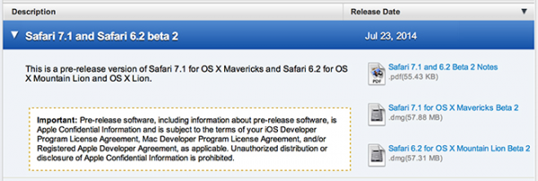 Safari 是一款浏览器、一个平台,也是对锐意创新的公开邀请。无论在 Mac、PC 或 iPod touch 上运行,Safari 都可提供极致愉悦的网络体验方式,更不断地改写浏览器的定义。 Safari 以惊人速度渲染网页。与 Mac、PC 及 iPod touch 完美兼容。让最爱网站一目了然。聪明的它还会检查拼写和语法。 苹果向开发者分发了OS X 10.9 Mavericks上使用的Safari 7.1 Beta2,以及用于OS X 10.8 Mountain Lion上的Safari 6.2 Beta2。带来小幅升级,发行说明中苹果希望开发者们注重测试密码与信用卡信息的自动完成功能。并再次希望开发者们测试子像素渲染等网页通用兼容功能