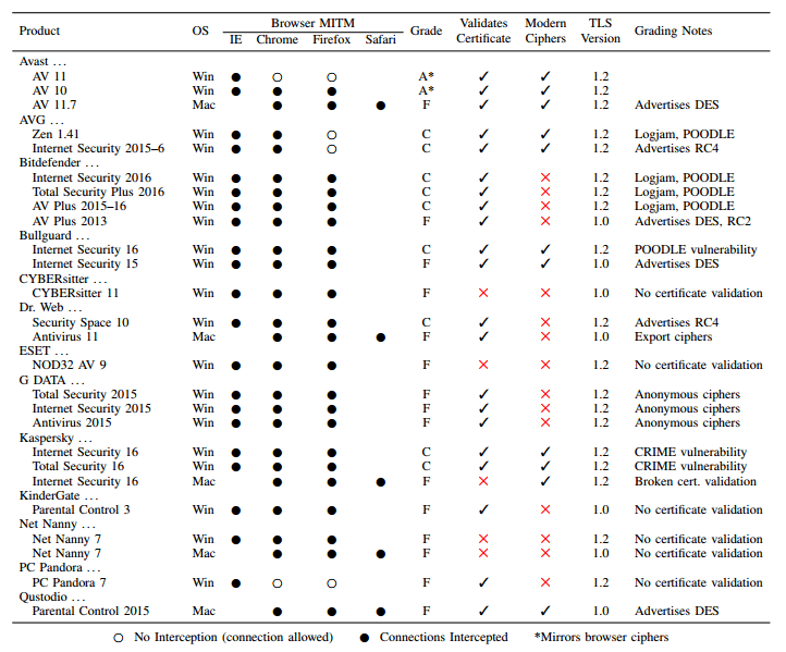 这种方式已经是防病毒领域不成文的潜规则。通过软件方式干绕 HTTPS 流量会降低安全性。更糟糕的是,病毒扫描会引入各种新的漏洞。根据报道,研究专家分析了 80 亿个访问 Firefox 更新、知名电商网站和 Cloudflare 内容分布网络的安全连接,连接至 Firefox 的 4% 连接被截取,电商网站有 6.2%,连接至 CloudFlare 的 10.9% 连接被防病毒软件拦截。而 97% 的 Firefox 连接,32% 的电商连接,54% 的 Cloudflare 连接在被拦截之后变得不再安全。