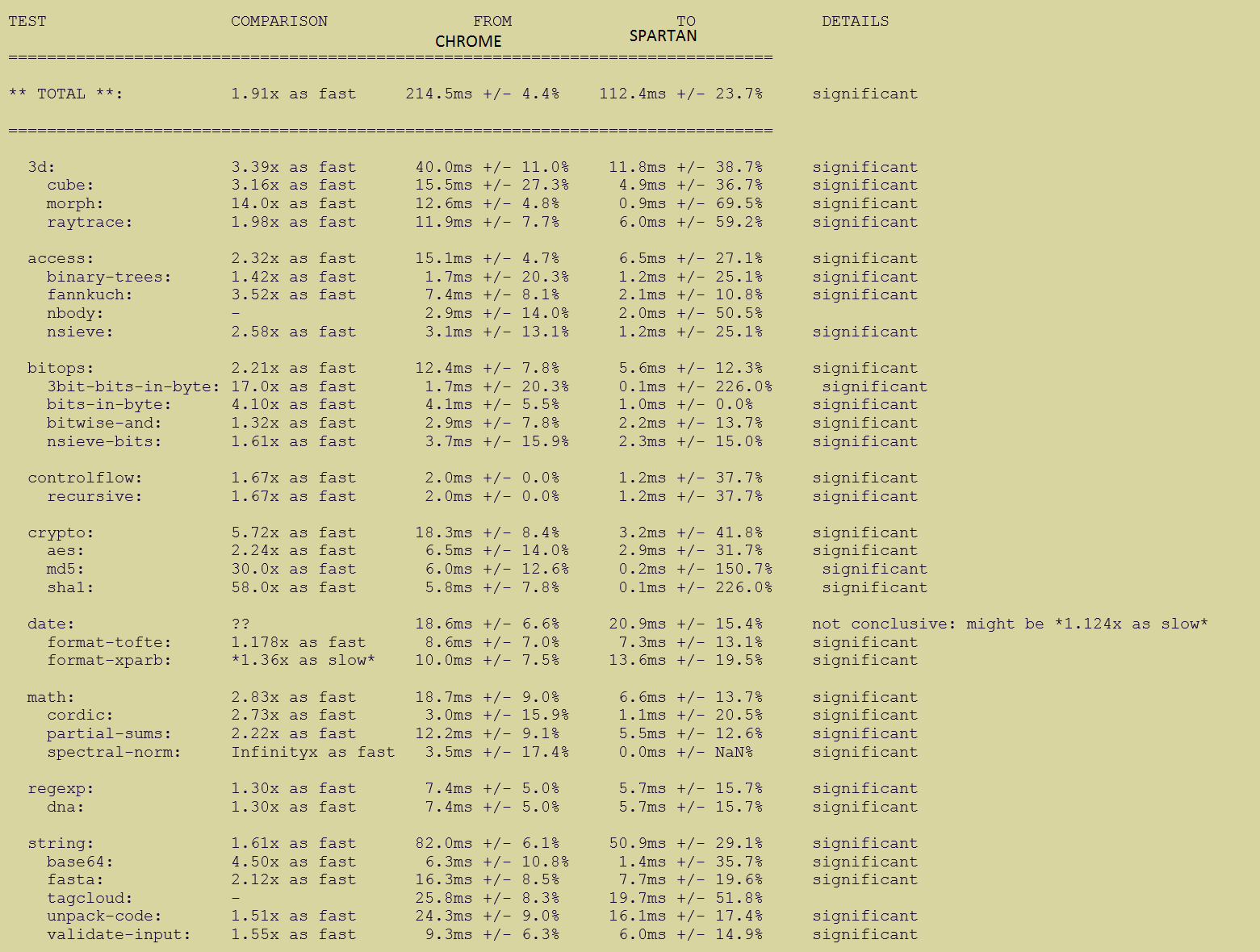 国外网站贴出一张用于比较 Spartan 和 Chrome 两个浏览器的性能,后者的版本是 41.0.2272.101。不过这张图片没有任何说明,也不清楚具体作者。 从该张图中我们看出 Spartan 简直完爆 Chrome 浏览器,只是在 date 小项中微弱差距低于 Chrome。 2015年4月1日业界资讯 淘江湖分享到淘江湖开心网分享到开心网豆瓣分享到豆瓣人人网分享到人人网腾讯微博分享到腾讯微博新浪微博分享到新浪微博QQ空间分享到QQ空间微信分享到微信 你真以为 Windows 10 免费?Meteor 1.1 发布 支持 Windows/MongoDB 3.0 相关文章2026 年最新国内 wordpress 网站优化插件,2025年12月13日但是我要用 bbr3,那服务器系统哪个好?2025年12月12日服务器的操作系统,为什么你都不推荐Ubuntu 24?2025年12月12日最好的服务器系统是哪个,我用的腾讯云的服务器2025年12月12日别再让利润烂在地里了!这套 RAW 系统,帮你省出一辆奥迪!2025年12月4日免费全开源家具行业 MES 系统:家具工厂实现数字化升级的最佳选择2025年11月27日