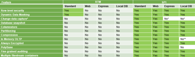 - 下表比较了现在可在 SQL Server 2016 SP1 的 Standard、Web、Express 和LocalDB 版本中启用的功能列表。