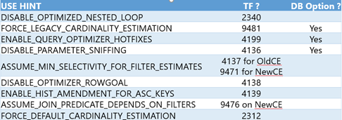 - 新的 USE HINT 查询选项 – 添加了一个新的查询选项 OPTION(USE HINT('<option>’)),以使用下面列出的可支持的查询级别提示来更改查询优化程序行为。 支持九种不同的提示,以启用以前仅通过跟踪标志可用的功能。 与 QUERYTRACEON 不同,USE HINT 选项不需要 sysadmin 权限。