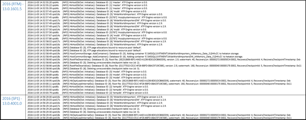 - 从错误日志中删除嘈杂的 Hekaton 日志消息 – 使用 SQL 2016,Hekaton 引擎开始在 SQL 错误日志中记录附加消息以支持和故障排除,比如压倒性的、泛滥的错误日志与 hekaton 消息。 基于 DBA 和 SQL 社区的反馈,启动 SQL 2016 SP1,Hekaton 日志记录消息在错误日志中减少到最少,如下所示。