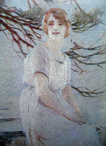 三十年代,江苏丹阳的杨守玉教授受油画笔触、块面、调色的明暗对比启发,用重叠交错的针迹走线,“以新意,运新法”,开创乱针绣(也名正则绣)驰誉一时(图1-4-5-6 杨守玉绣 乱针绣《少女》)。二者的创作都先后极大地丰富了苏绣的艺术表现力。