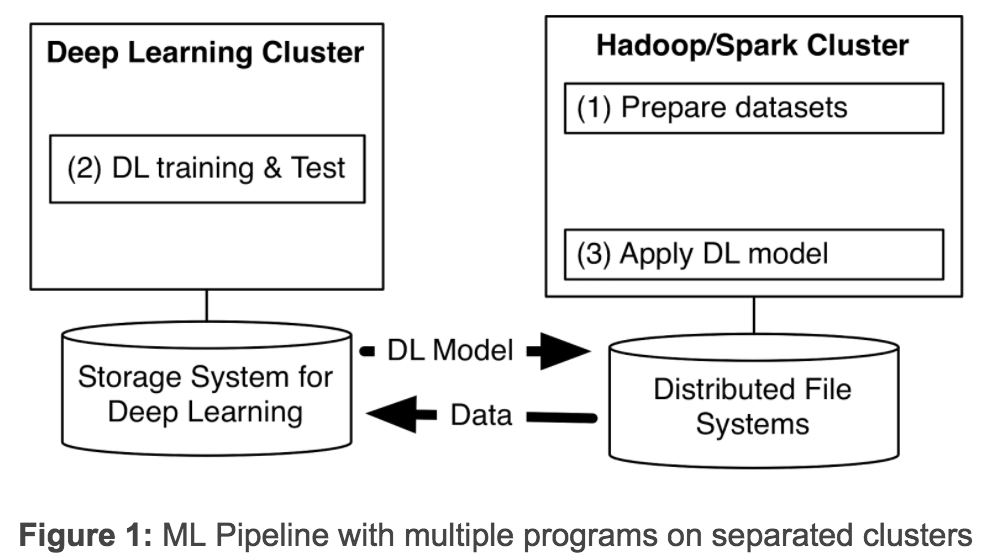 Yahoo 在博客上表示,深度学习(DL)近年来发展迅速,为了从大量的数据中挖掘价值,需要部署分布式深度学习。现有的深度学习框架,往往需要设立单独的深度学习数据组。这强迫我们为同一个机器学习流水线创建多个程序(见下图)。维护多个独立的数据组,要求我们在它们之间传输海量数据集——这导致不必要的系统复杂性和端到端的学习延迟。