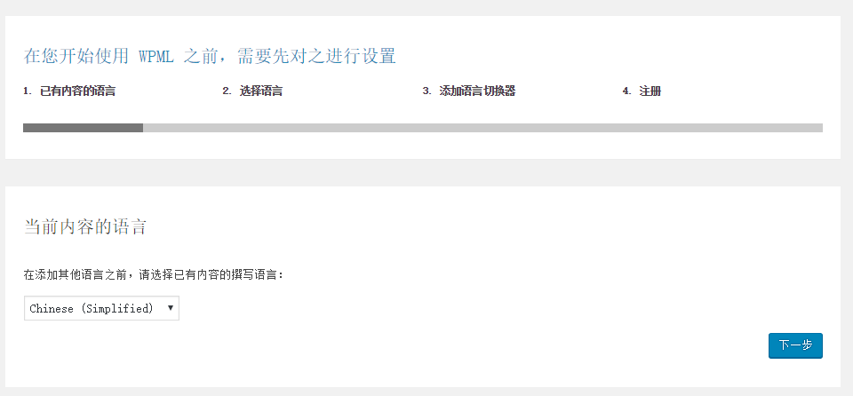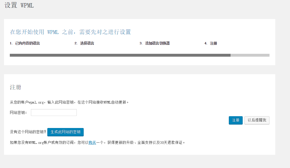 直接点,稍后提醒我!ok,WPML就算配置ok了。然后我们打开主题选项 – 页眉顶部栏