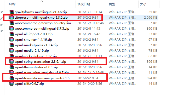 如上图,我们在项目中重点就是使用这三个红色框框圈起来的。sitepress-multilingual-cms-3.3.6.zip(必装)、wpml-string-