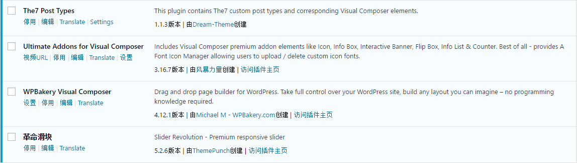手。我们真正用的上的插件:The7 Post Types(the7文章类型插件)、WPBakery Visual Composer(可视化编辑器)、革命滑