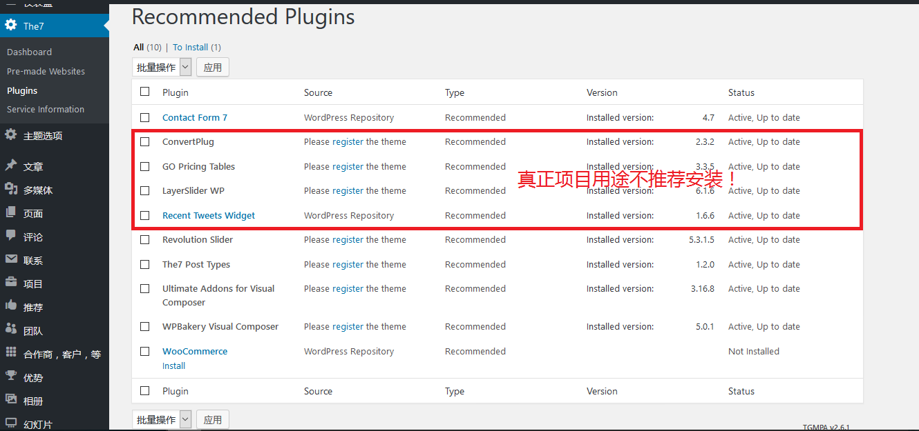 诸君一看图便知,woocomerce、The7 post type是可选的,按需选择即可。 the7 v5.0.1深度汉化版依旧一包烟支持,您可以直接联
