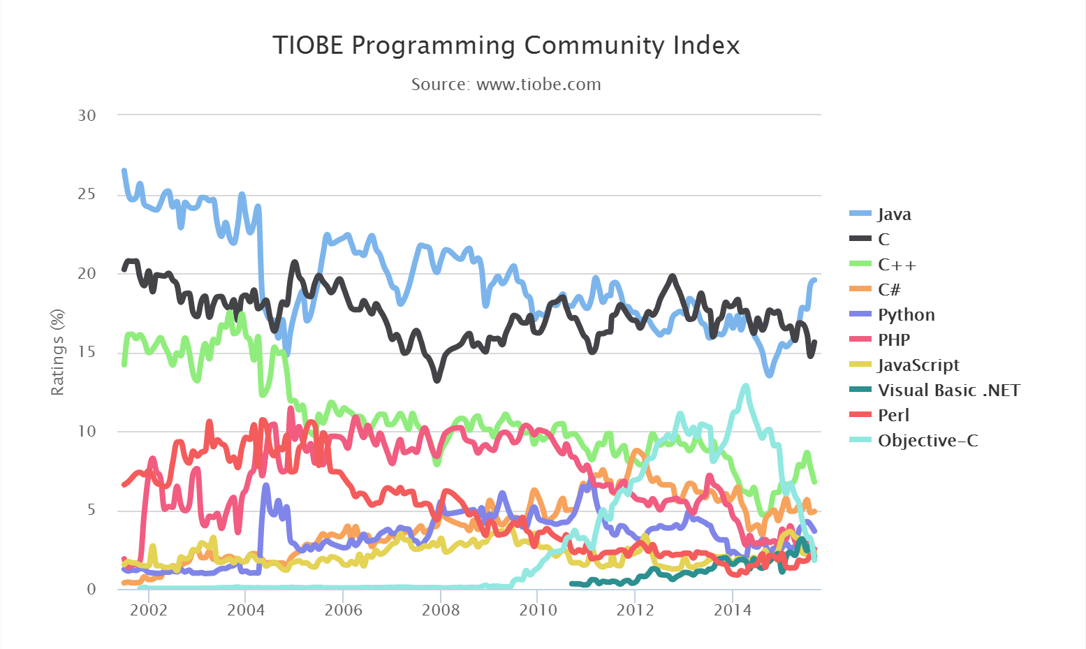 该指数可以用来检查你的编程技能是否仍然是最新的或作出什么开始建立一个新的软件系统时,编程语言应采取的战略决策。在 TIOBE 指数的定义可以在这里找到。