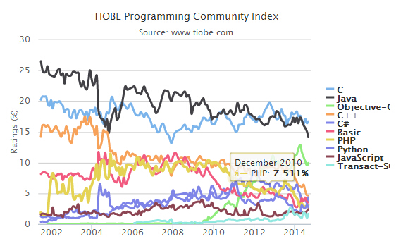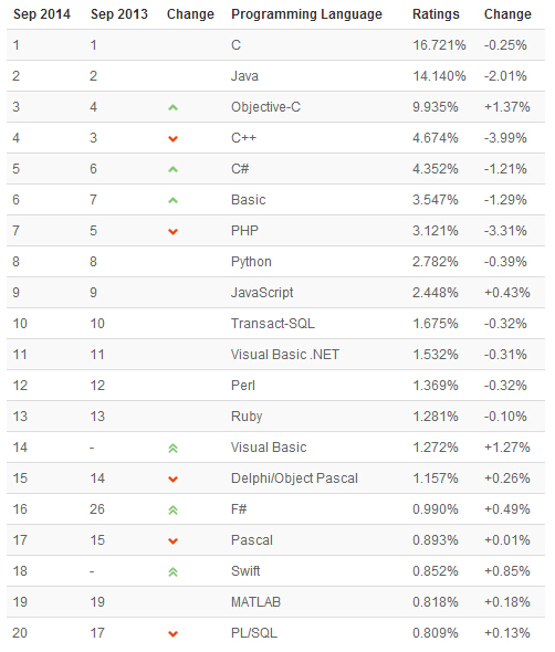 TIOBE 2014年9月编程语言排行榜今天发布,Java、C++跌至历史最低点,前三名则没有变化,C、Java、Objective-C。 尽管Java排名第二,但其份额却在下降,从图表上可以看出,下降了-2.01%。另外排名第四的C++份额下降幅度也较大,为-3.99%。 TIOBE编程语言社区排行榜是编程语言流行趋势的一个指标,每月更新,这份排行榜排名基于互联网上有经验的程序员、课程和第三方厂商的数量。排名使用著 名的搜索引擎(诸如Google、MSN、Yahoo!、Wikipedia、YouTube以及Baidu等)进行计算。