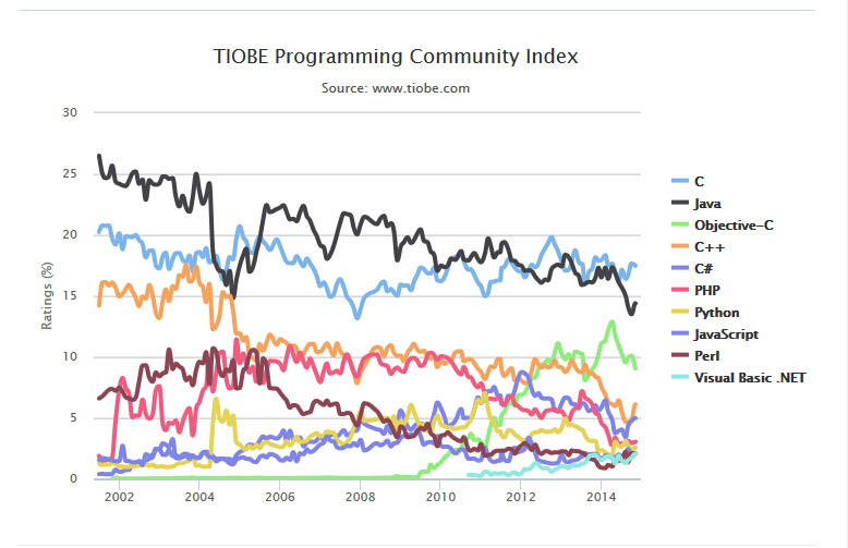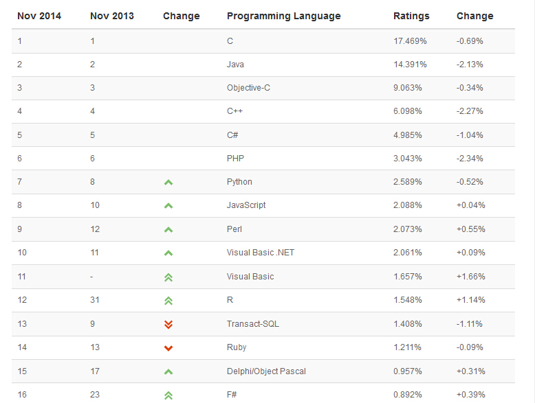 TIOBE 2014 年 11 月编程语言排行榜今天发布,前三名仍然没有变化,C、Java、Objective-C。但因为大数据的炒作,本月R跃升至12位,上个月排名15。