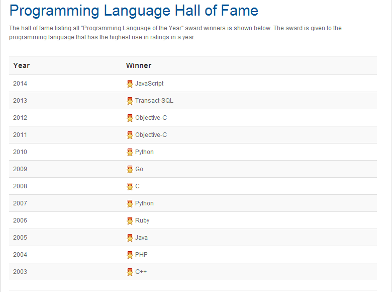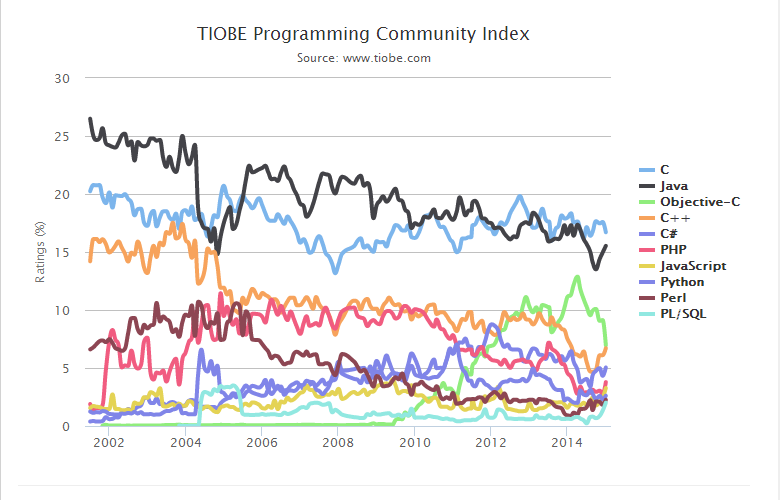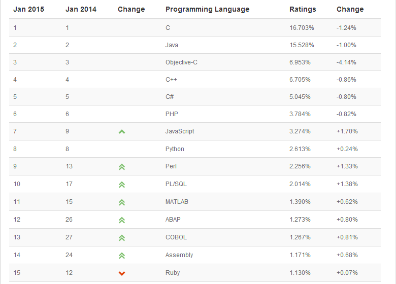 2015 年 1 月编程语言排行榜今天发布,JavaScript编程语言成为年度TIOBE的语言,前三名则没有变化,C、 Java、Objective-C。TIOBE 编程语言社区排行榜是编程语言流行趋势的一个指标,每月更新,这份排行榜排名基于互联网上有经验的程序员、 课程和第三方厂商的数量。排名使用著名的搜索引擎(诸如 Google、MSN、Yahoo!、Wikipedia、YouTube 以及 Baidu 等)进行计算。
