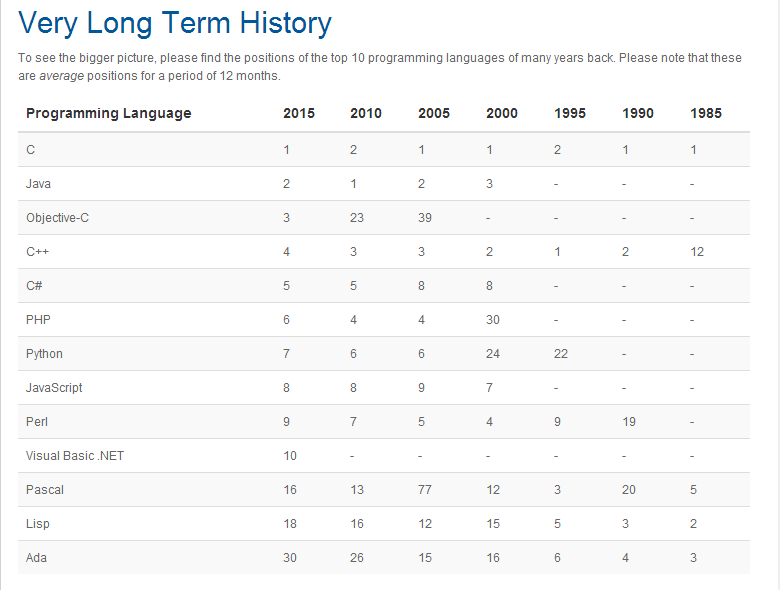 TIOBE 编程语言社区排行榜是编程语言流行趋势的一个指标,每月更新,这份排行榜排名基于互联网上有经验的程序员、课程和第三方厂商的数量。排名使用著名的搜索引擎(诸如 Google、MSN、Yahoo!、Wikipedia、YouTube 以及 Baidu 等)进行计算。请注意这个排行榜只是反映某个编程语言的热门程度,并不能说明一门编程语言好不好,或者一门语言所编写的代码数量多少。