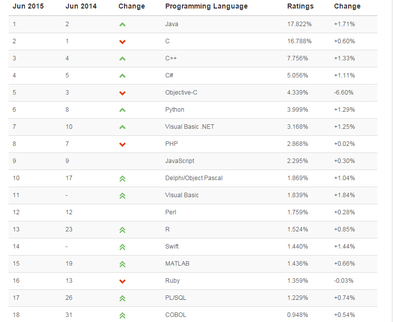 TIOBE 2015年6月编程语言排行榜 Objective-C 下跌