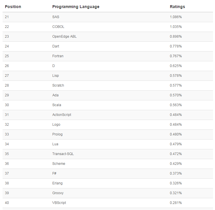 - 4th Dimension/4D, ABC, Alice, Apex, APL, AutoLISP, Automator, Bourne shell, C shell, Caml, CL (OS/400), Clojure, Common Lisp, Eiffel, Emacs Lisp, Etoys, EXEC, Forth, GNU Octave, Go, Haxe, Icon, IDL, Inform, Io, Ioke, J, JADE, Korn shell, Magic, Mathematica, Modula-2, MQL4, MUMPS, NATURAL, NXT-G, OCaml, OpenCL, Oz, PL/I, PostScript, PowerShell, Rust, Smalltalk, SPSS, Standard ML, Stata, Tcl, Verilog, Z shell
