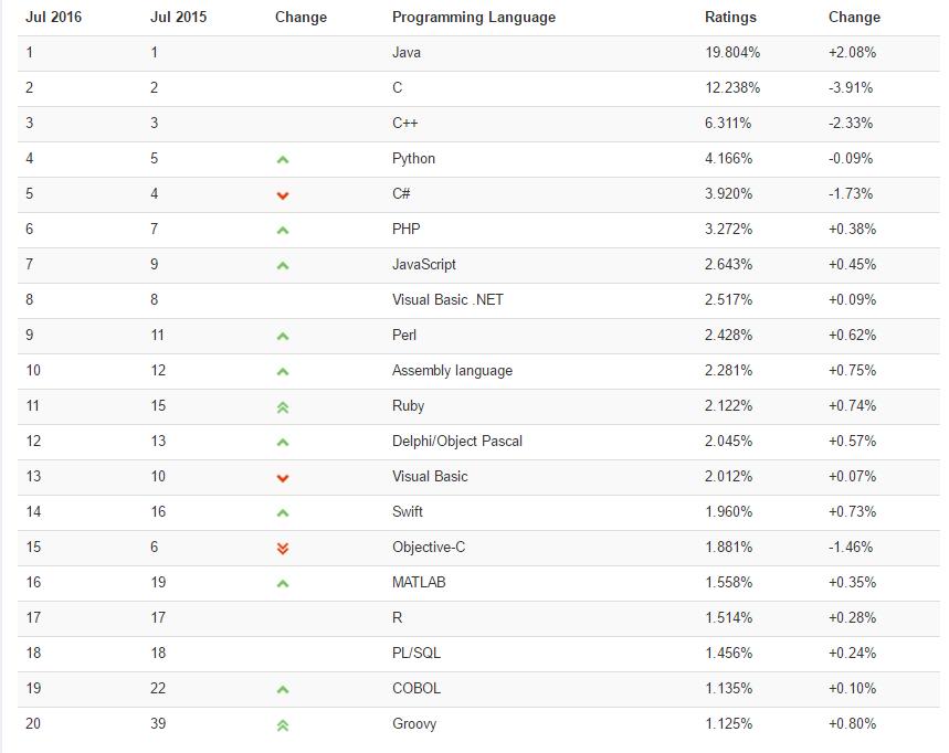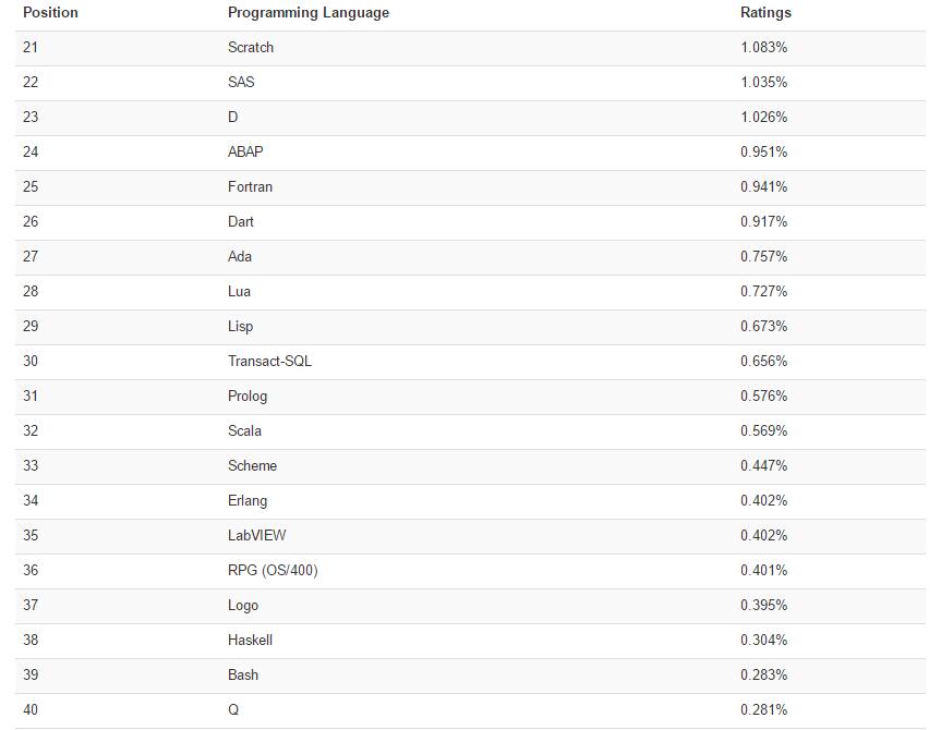 很多人都惊讶,是什么原因让这门底层编程语言又一次进入排行榜前十?人们不理解为什么这么生产力低下,且程序员在进行编程时容易出现错误的编程语言,现在又流行了起来。这个解释起来有2方面原因,首先是能够运行汇编代码的小设备正在激增,比如你的智能牙刷和咖啡机都在运行汇编,另一方面是性能,在性能上,没有什么语言可以击败汇编。有趣的是老树发新芽是本月的现象,古老的Tcl 从65位提升到48位,CFML从102位提升到66位,Maple 从94位提升到74位。