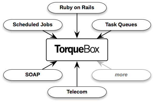 TorqueBox (目前已改名为 TurkeyBox)是一个集成了流行的Ruby技术的忍者级应用平台,与 Ruby on Rails 类似,同时扩大了Ruby应用功能,以支持包括任务调度,任务队列,SOAP 处理和远程通讯。