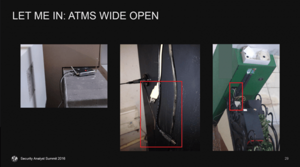 除了不安全的系统之外,Kochetova同时也警告存在不安全的硬件。她表示能够非常容易打开ATM然后使用USB端口来感染系统。在部分情境下因为通信线缆或者路由器的连接甚至在不打开ATM的情况下也能进行访问,在感染恶意程序之后能够通过特殊指令掏空内部的钱财。