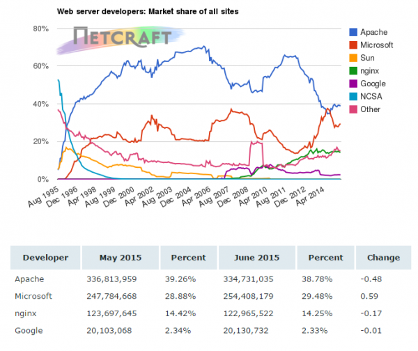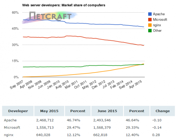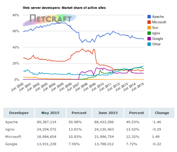 Apache, 微软和Nginx加在一起占了全世界网络主机总数的88%以上,这也意味着这些厂商目前是网络主机市场最受欢迎的选择。但从Web Server报告中可以看出,Nginx是三家中唯一一家市场份额持续增长的公司,相较于去年已经增长了三个百分点,而Apache和微软在此期间都有所 减少。而除了以上三家公司以外,第四位的网络主机使用最多的品牌是lighttpd,仅占了总数的0.46%。