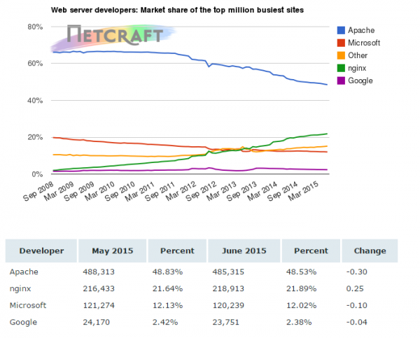 Apache本月网络主机数明显增长,净增长量达到 24800台。Nginx紧随其后增长了22800台,这个增长也是的Nginx的市场份额增长了0.28% 从而达到12.4%。相比于Nginx的增长,Apache本月虽然有了很大的净增长,但是市场份额上却遭受了一个小范围的下落。
