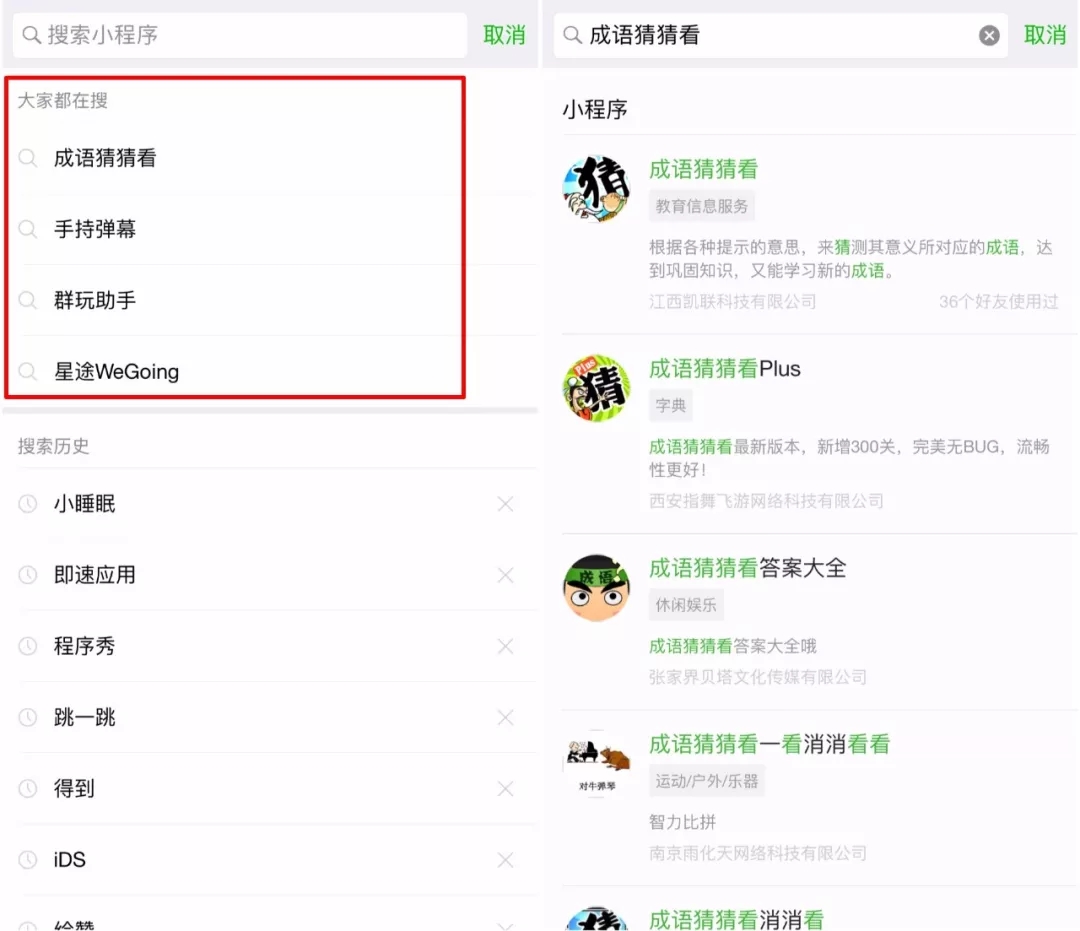 小程序微信搜索结果列表再次更新,通过搜索出来的小程序结果,新增了小程序的类目、主体公司、好友使用数量三个信息。有了这些数据,能帮助用户判断这个小程序是否是自己需要用到的,避免混淆。