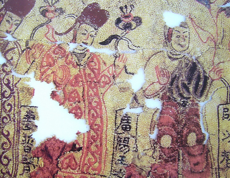 1965年甘肃莫高窟出土的彩绣佛像供养人(图1-1-4-1),现藏敦煌研究院,残高56CM,残宽59CM,有款识“太和十一年广阳王”,公元487年绣制,是目前已知最早的有明确纪年的绣品,人物旁的榜书题名形制上与其时绘画作品类似(图1-1-4-2,局部),北魏佛像画风格明显,现藏敦煌研究院。绣料有三层,由两层细而软的平纹丝织物夹一层麻织物构成,绣线色有蓝、绿、红、黄等,用色鲜艳明快,辫子针绣成,有大面积铺绣。据此绣纪年、施主职衔、绣面风格和题材、人物衣饰等特征,其施主应为北魏四代广阳王中的元嘉。此绣手工精湛,用料、用色讲究,且有明确的榜书题名和纪年,是一件不可多得的时代精品。