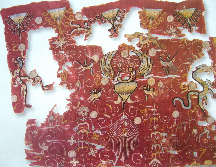 红绢刺绣共命鸟纹残片(图1-1-4-4),南北朝,1972年新疆吐鲁番市阿斯塔纳382号墓出土,现藏新疆博物馆,残高22.5CM,残宽28.5CM,现藏新疆博物馆。地有双层,原白色为里,大红色为面,用蓝、绿、黄、黑、红、褐色丝线,辫子针绣成。图案中心以夸张变形的共命鸟为主体,明显受佛教传说故事影响,两边环绕四只小鸟,周边环绕螭龙、花草、星辰,布局合理,配色明丽,线条流畅,是为精品。