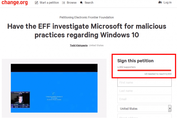截至目前,微软和EFF都并未针对这项请愿活动发表声明,不过在请愿页面上有很多用户支持这个创意来对软件巨头进行调查。目前在该请愿页面下方的评论区都是深受Windows 10升级影响的受害者。