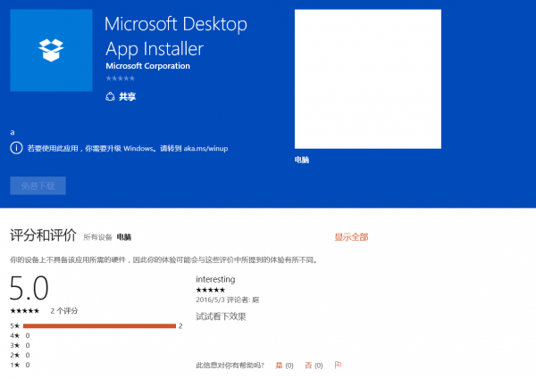 需要注意的一点是,如果想要下载安装 Microsoft Desktop App Installer,必须升级到 Redstone 更新,也就是注册为 Insider 用户,像笔者这样正式版 Build 10586 的用户无法下载。
