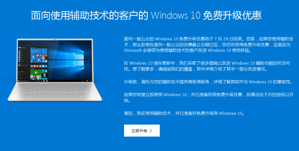 微软食言了,不过这一次是没有如之前说的那样消灭福利。距离Windows 10免费升级已经过去5个多月,理论上说,在此期间,用户从Windows 7、Windows 8.1升级正版Win10需要支付888元的操作系统费用。但“面向使用辅助技术的客户的Windows 10免费升级优惠”依然没有结束,该通道仍旧有效。其实在免费期结束后就有用户发现了这个钻空子的方法,微软扬言会在几周内封杀掉,可事实并没有。