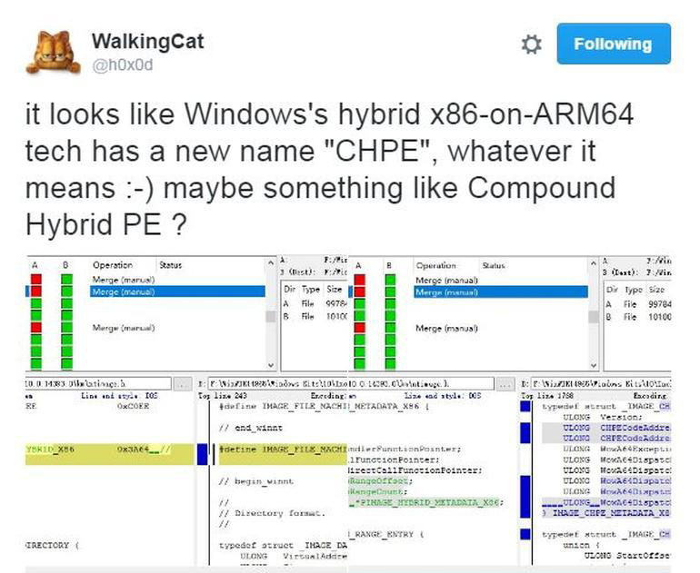 通过模拟器的形式使其在 ARM 64 设备上运行 x86 应用,目前微软正努力对 Windows 10 Mobile 系统代码进行改进。据爆料,这项微软内部正在研发推进的 “Windows’s hybrid x86-on-ARM64 tech” 项目代号名为 “CHPE” 。