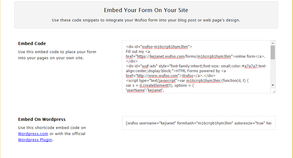 推荐使用wordpress插件(Wufoo Shortcode Plugin)配合简码的方式:插件地址:https://wordpress.org/plugins/wufoo-shortcode/