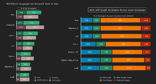 在2015年Q1报告中,几经修改的Swift表现非常强劲,但调查显示,拥有多年开发经验的开发者依然钟情于老牌语言。在亚 洲,Java、HTML5/JavaScript、C/C++、C#等语言依然最受青睐,超过65%的Java、Objective-C、C#和C /C++开发者本身便拥有着相关语言的学历基础,仅有2%的开发者专注于Swift语言,同时,有27%的开发者在自学Swift。不过,值得注意的 是,Swift并没有蚕食Objective-C的市场份额,而是吸引了一批新的开发者加入。