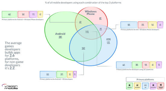 占据高端市场的iOS和随处运行Android两大系统已称霸移动平台份额,这点是毋庸置疑的。时至今日,尽管碎片化问题严重,但Android依然是最受欢迎的开发平台,但App Store所贡献的应用经济价值却是最吸引开发者的存在。调查显示,37%的移动开发者同时将iOS和Android作为目标平台,只有7%的开发者无意于iOS、Android和Windows Phone三大平台,而在未来,将会出现最流行的应用“iOS-only”甚至“iOS-first”的局面。
