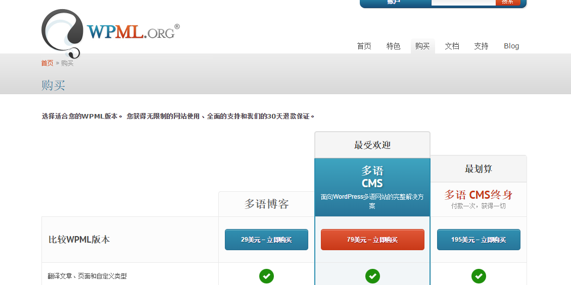 WPML官方网站:https://wpml.org/ 当然对应也有WPML中文网站:https://wpml.org/zh-hans/ 售价如下