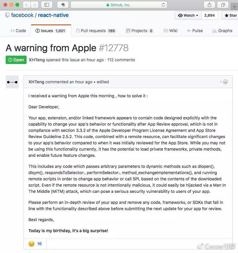 就在今天早上,Facebook的React-Native github仓库里有这么一条issue:https://github.com/facebook/react-native/issues/12778,瞬间被无数开发者刷爆。