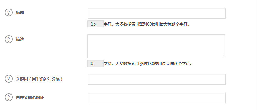 标题、描述、和关键词这些看你文章性质而定,看自己对SEO的理解程度去搞。尽量都填写!都会有自动提示字数!