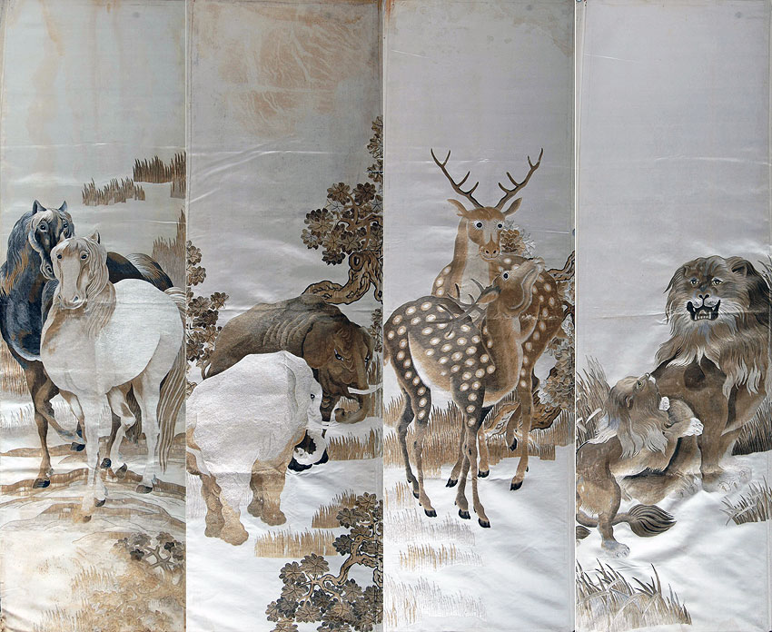 几千年的桑蚕织绣文化在地方上多有蕴养,民间刺绣发展至明末清初,在各地均已形成流派体系,这些流派在使用的材料、针法上没有很大区别,但在主要常用针法、技巧、题材等发面各有独特风貌;其中苏绣、湘绣、蜀绣、粤绣以所属民系风俗为依托,因题材而制宜针法技巧,从历史名绣中汲取营养,又在绣庄经营的生产加工过程中去芜存菁,力求精工细作,继而成就了有自己特点的地方名绣。四大名绣在清末声名鹊起,也源于苏、湘、蜀、粤等地的富庶,地方上官绅商贾云集,商品绣交易空前繁荣,技艺切磋,互相促进,水准提升,售价便高,名声则远播矣。绣品不拘囿于日常生活用品的制式效果,追求观赏性,并在名人名绣的滋养下开发出各自相对独到的绣制题材。对我们来说,不能弱化名绣之间的风格、题材、色彩、用材等特征,明辨其风貌特征是品鉴的第一步。